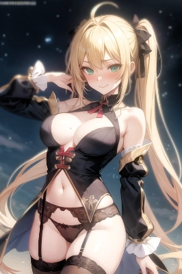 masterpiece, best quality, extremely detailed, anime, Sexy Illustration, High Definition Illustration, embarrassed expression, blush,black panties, oiled skin, wet skin, arms behind back,half updo, smile,model posing, thighs, cowboy shot, a cool boy, good-looking guy, handsome man, twintail, ahoge, garter belt, blonde hair, green eyes, dancer, different world, blushing, night sky,,,