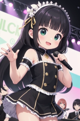 (((very longest hair))),black hair, smile, straight Hair,hair ribbon,mintgreen stripe,Black Eyes,flat chest,straight Across bangs,princess Cut, Very Long Sideburn,roundry Head,Droping eyes,cute,Meekness,Bob Cut,long back hair,12 years Old,loli, Idol,On The stage,