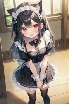 1girl, ((masterpiece)), ((best quality)), (ultra-detailed), ((kawaii)), (lovely),game cg,14years old,(cat ear:1.3),((small breasts:1.3)),red eyes,black hair,long hair,hair intakes:1.3,red collar:1.3, BREAK,Valentine day:1.3,chocolate ,holding chocolate:1.3,hands on chest,maid uniform:1.3,sleeves past wrists, ((white pantyhose)),standing,looking up,,from front,smile,,