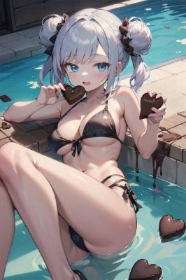 masterpiece, best quality, extremely detailed, anime, girl,<lora:flat2:0.55> <lora:hairdetailer:0> , bobcut, brown hair, purple eyes, (loli face:1.2),((medium breasts)),((Valentine)), chocolate, ((falling chocolates)), ((chocolate pool)), ((chocolate bikini)), happy, cleavage, underboob, side boob,