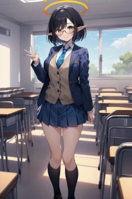 masterpiece, best quality, extremely detailed, anime, many girls, solo, brown eyes, green hair, bowlcut hair, yellow hairband, short hair, large breasts, cleavege, a yellow bow tie, <lora:eyecolle_edelweiss_v100:1> ,at Valentine Day, holding chocolate, smile, embarrassed, virgin killer sweater, ,