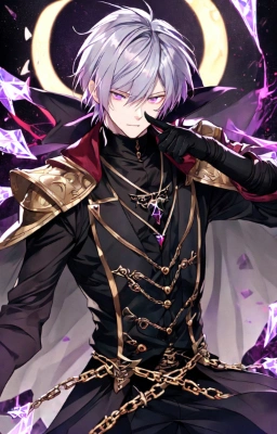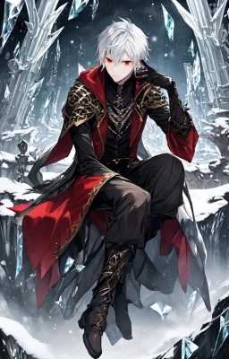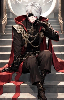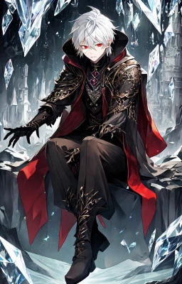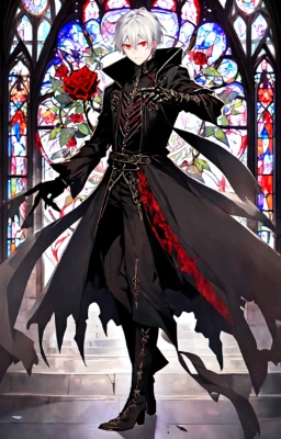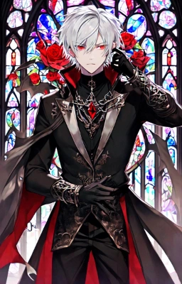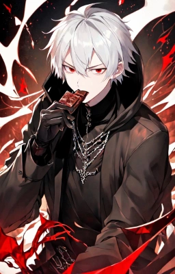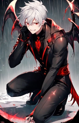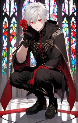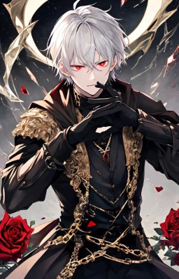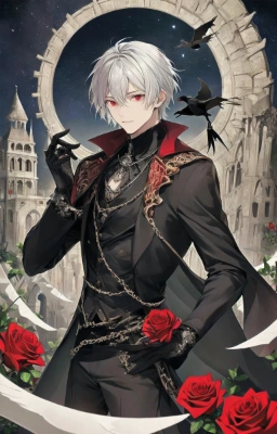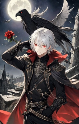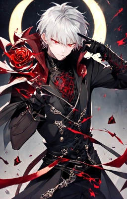 masterpiece, best quality, extremely detailed, anime, a cool boy, good-looking guy, handsome man, shorthair, silver hair, white hair, red eyes,very short hair, sharp eyes,beast eyes, glare,Grim Reaper,black gloves,red crystal,black crystal,rose,devil,beast hand,ruins,night sky,crow,