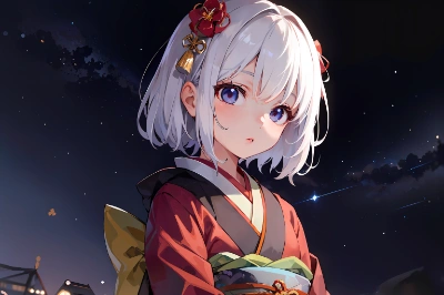 very cute female child,10 yo,white hair,bangs,medium hair,flat chest,standing,