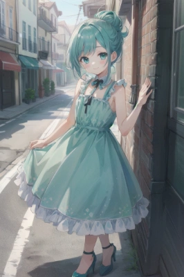 masterpiece, best quality, highres, 1otoko no ko, off-the-shoulder top, skinny jeans, sneakers, かわいい, flat chest, aqua hair, aqua eyes, half updo, smile<lora:flat2:0> <lora:hairdetailer:0.5>,