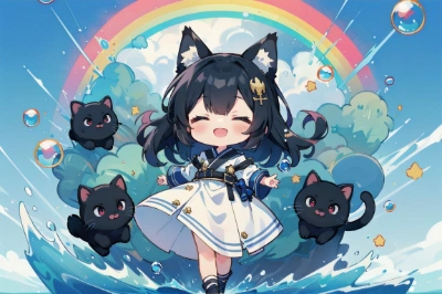 masterpiece, best quality, extremely detailed, anime, (fantasy:1.3), 1girl, solo, kawaii, 17yo, medium breasts, black shirts, (red shorts:1.5), (yellow shoes:1.5),BREAK,beautiful detailed face and eyes, grin, black hair, short hair, black mouse ears, black eyes,BREAK,(castle:1.5), (a lot clouds:1.5), ((yumekawa, yumekawaii)), (wonderland street:1.2), (rainbow:1.2), fluttering petals, (a lot flowers:1.2),,