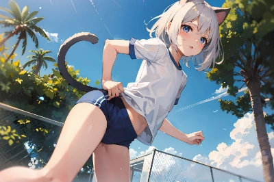 very cute female child,10 yo,white long hair,flat chest,cat ears,cat tail,
