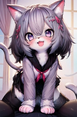 all fours, (chibi:1.3), open mouth,cat tail,play together,