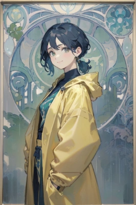 《masterpiece》, 《best quality》, 《ultra-detailed》, gravure, (photo realistic detail:1.2),(cute:1.3), professional lighting,1girls,phot,cowboy shot,looking at viewer,smile,tall woman,(short hair:1.3),(pony tail:1.2),(yellow Raincoat:1.2),(rain:1.1),(by famous artist, art nouveau:1.5),plant, hydrangea,,