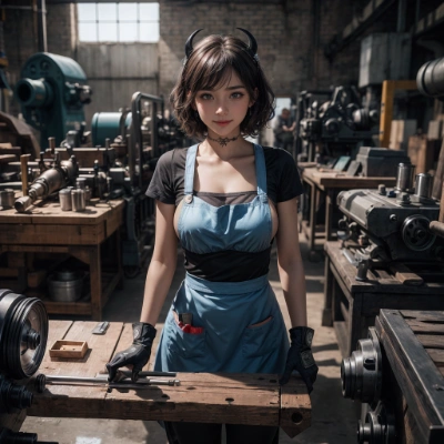 realistic, photorealistic, super detailed, no natural light, enclosed space, no outside view, subdued lighting, moody atmosphere, dark shadows, subtle highlights, mysterious atmosphere, tabletop lighting only, Fisheye lens, close-up, human figure front, young beautiful girl, gothic dress:1.5, highly detailed, official art, colored skin, blue eyes, athlete, collarbone, teen, tattoo, devil horns, highly detailed face, highly detailed eyes, gothic bodysuit:1.5, curly brown hair, parted bangs, short hair, asymmetrical hair, cute, smile, magical protection, arcane shield, protection spells, barrier creation, magical guardian, warning runes, Red Work Gloves, Machine Tools, Gears, Blueprints, Clockwork Works, Steam Powered Devices, Engineering Skills, Craftsman Works, Handmade products, unique designs, intricate details, creative expression, skilled craftsmanship, the room is surrounded by machines, presses, metalworking machines, workshops, presses, table rump, metalworking machines, lathes, new devils Creating tools for guraAIart,<lora:EMS-179-EMS:0.600000>,<lora:EMS-90741-EMS:0.200000>