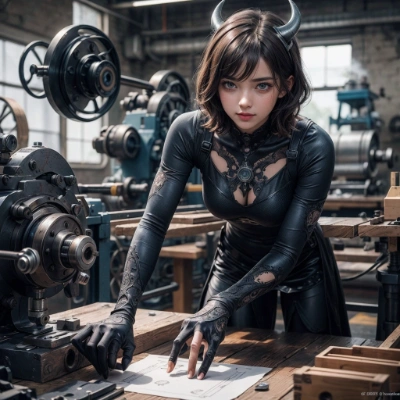 realistic, photorealistic, super detailed, no natural light, enclosed space, no outside view, subdued lighting, moody atmosphere, dark shadows, subtle highlights, mysterious atmosphere, tabletop lighting only, Fisheye lens, close-up, human figure front, young beautiful girl, gothic dress:1.5, highly detailed, official art, colored skin, blue eyes, athlete, collarbone, teen, tattoo, devil horns, highly detailed face, highly detailed eyes, wear gothic dress:1.5, red t-shirt, curly brown hair, parted bangs, short hair, asymmetrical hair, cute, smile, magical protection, arcane shield, protection spells, barrier creation, magical guardian, Red Work Gloves, Red Work Apron, Machine Tools, Gears, Blueprints, Clockwork Works, Steam Powered Devices, Engineering Skills, Craftsman Works, Handmade products, unique designs, intricate details, creative expression, skilled craftsmanship, the room is surrounded by machines, presses, metalworking machines, workshops, presses, table rump, metalworking machines, lathes, new devils Creating tools for guraAIart,<lora:EMS-179-EMS:0.600000>,<lora:EMS-90741-EMS:0.200000>
