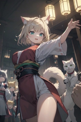 お題の「猫」にちなみ、猫狂いの浮世絵師・歌川国芳の描いた「古御所の妖猫(ばけねこ)」のように、巨大な化猫と踊る猫達がいる絵を美少女で再現してみようと試みる……。 どうも〝背後に巨大な猫〟と〝踊るたくさんの猫娘達〟というのが両立できないようなのですが、こちらは〝踊るたくさんの猫娘達〟がうまく出た一枚。 普通の猫ちゃんもいっぱい。