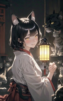 (masterpiece),(perfect anatomy),best quality,extremely detaile,cinematic lighting,((full boy shot)),a girl,bob cut,black hair,Cat ear,yellow eyes,evil smile,Japanese clothes,white and red clothes,dancing,cat dance,(Scenery:Japanese style mansion,faint light,deep shadows,Japanese style lighting equipment,lantern,a giant huge cat on behind,a lot of cats,Japanese style,fantasy,horror), ((shiny eyes,ultra-detailed background,beautiful detailed eyes,realistic,hyper realistic character,high detail))