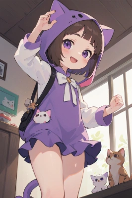 masterpiece, best quality, extremely detailed, anime, girl,<lora:flat2:0.55> <lora:hairdetailer:0> , bobcut, brown hair, purple eyes, (loli face:1.2),((cat)), (cat costume), miniskirt, happy smile, thighs, from below,,