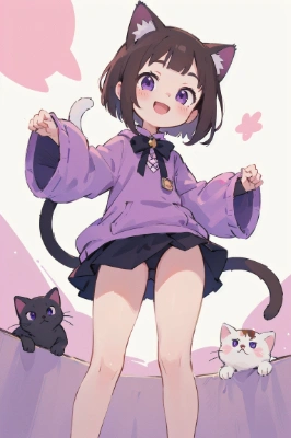 <lora:flat2:0> <lora:hairdetailer:0.5>, masterpiece, best quality, extremely detailed, beautiful detailed glow, ultra high res, beautiful, best aesthetic, 8k, anime, a pretty woman, longhair, blonde hair, pink eyes, ((medium breasts)),((cat)), (cat costume), miniskirt, happy smile, cleavage, from above,cat pose, hip,