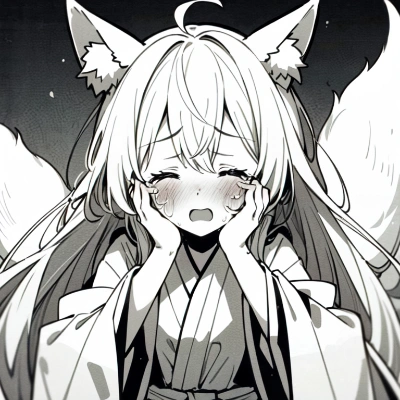 1girl, (monochrome), focus face, front face, tearful, face down, close eyes, crying face, cover your eyes with your hands, cute girl, 14 yo, (fox tail and ears), shiny hair, very long straight hair, miko,,