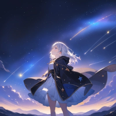 best quality, intricate watercolor, limited color palette, 1girl, silver hair girl looking up the starry sky, night sky is full of brilliant silver stars, she is wearing light blue fantasy wizard robe with golden embroidery, stretch out hand, stars, shooting stars, milky way, soft lighting, full body,
