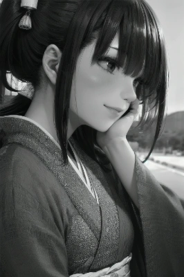 masterpiece, high-res, extremely_detailed, (photorealistic, monochrome, grayscale:1.3), (Japanese_countryside_background, outdoor, daylight, frontlight), BREAK, (1girl, cute, kawaii, lightweight, shiny_hair, middle_hair, tied_hair, shiny_eyes, shiny_skin, tanned, blush, smile),BREAK, wearing_japanese_kimono, upperbody, looking_away, <lora:flat2:-0.5> <lora:LowRA:0.2>
