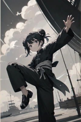 (monotone), (black and white), (ink painting), (rough brush strokes), (brush writing), (Chinese style), a girl, child, lolita, black hair, short hair, 2bun hair, black eyes, narrow eyes, sulking, closed mouth, cool, kung fu, kung fu clothes, kung fu pants, black loafers shoes, Kung fu pose, (Kicking), sky, cloud, caribbean, medieval sailing ship, (on ship), (on deck), middle ages, age of discovery <lora:flat2:0> <lora:noline:1> ,