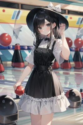 1 Rich girl, Gothic Dress, (Black hair:1.5), long waving hair, 16 age, Gothic bonnet, black eyes, expressionless, masterpiece, best quality, extremely detailed, anime, (playing bowling:1.5),,
