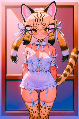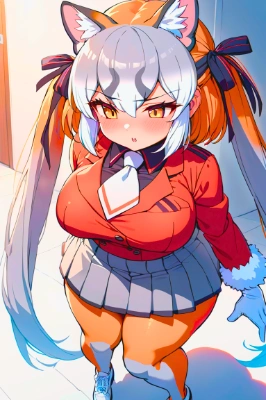 1girl, island fox \(kemono friends\), fox girl, animal ears, fox tail, long twintails, fox ears, multicolored hair, grey hair, orange hair, white hair, short hair, animal ear fluff, breasts, chubby_thighs, necktie, pleated skirt, black ribbon, white shoes, long sleeves, fur trim, white necktie, hair ribbon, red jacket, grey skirt, pantyhose, white gloves, (masterpiece, best quality, ultra detailed:1.2), rating: general, latest