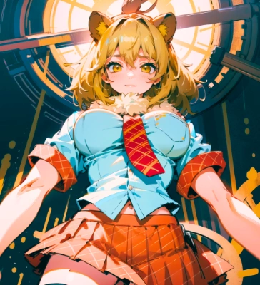 1girl, geoffroy's cat \(kemono friends\), kemono friends, small breast, animal ears, boots, bow, bowtie, cat ears, cat girl, cat tail, extra ears, garter straps, long hair, microphone, ribbon, shirt, skirt, suspenders, tail, thighhighs, twintails, masterpiece, best quality, ultra detailed, illustration, extremely detailed, newest,