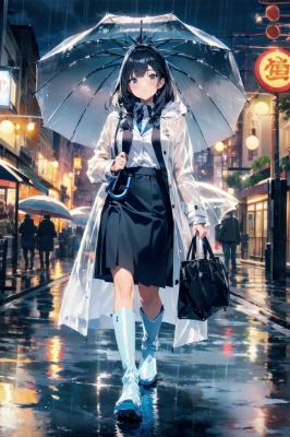Theme "Raincoat" clear+100, rain passing through, green raincoat, skirt hidden under the raincoat, blue rain boots, native yellow hair, twilight mood, children soaking wet, smiling faces enjoying the rain, Frog 🐸,<lora:noline:0.5> <lora:lightline:0.55> ,