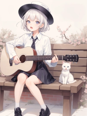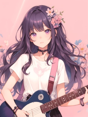 absurdres, highres, (Yellow background:1.3), (extremely detailed fine touch:1.3), (light colored pencil drawing:1.3), (pastel colour:1.3), (rough sketch:1.3), (hard light, studio light, light rays, dappled light, reflection, shadows, ray tracing:1.0), (2D:1.3), ///, (kawaii girl:1.3), Yellow background, Japanese anime style, handwritten style, short white hair, girl, handwritten illustration, light colors, fluffy atmosphere, gentle light, blue, flowers, T-shirt, singing, loud voice, eyes closed, mouth open , shout, electric guitar