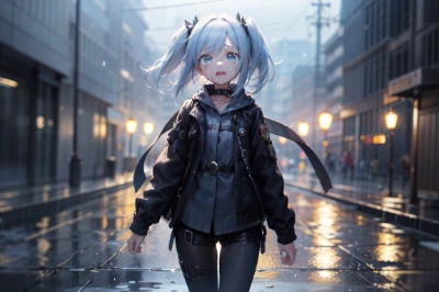 masterpiece, best quality, highly detailed CG unity 8k, depth of field, super fine illustration:1.5), illustration, CG, 2D, Anime style, complicated, (perfect anatomy), extremely detailed 1 girl, Raincoat, put on a hood, extremely detailed weapon, Assault rifle, singing in the rain, light and shadow, high quality fantasy art, beautiful digital artwork, exquisite character art, <lora:flat2:-0.3> <lora:deluster1:0.6> <lora:hairdetailer:1> <lora:saturation:-0.25> <lora:yawanuri:0.5> ,