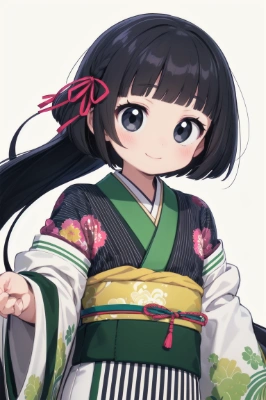 (((very longest hair))),black hair, smile,straight Hair,hair ribbon,Mintgreen stripe,Black Eyes,flat chest,straight Across bangs,princess Cut, Very Long Sideburn,roundry Head,Droping eyes,cute,Meekness,Bob Cut,long back hair,12 years Old, kimono, crying face,