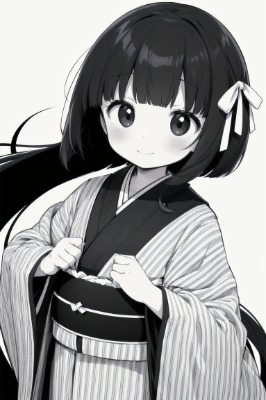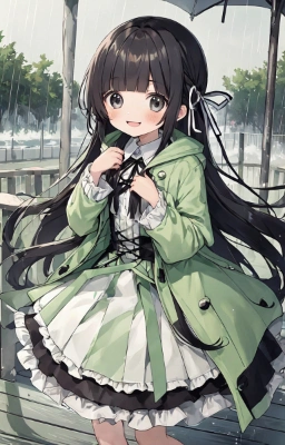 (((very longest hair))),black hair, smile,straight Hair,hair ribbon,Mintgreen stripe,Black Eyes,flat chest,straight Across bangs,princess Cut, Very Long Sideburn,roundry Head,Droping eyes,cute,Meekness,Bob Cut,long back hair,12 years Old, kimono,Raincoat,outdoor,