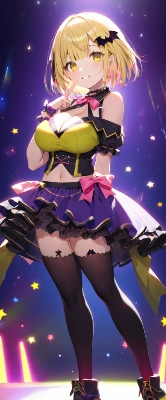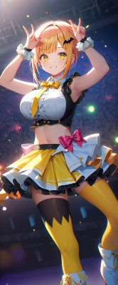 1girl, A kawaii lustful vampire girl with very short hair and buzz cut and bangs and sidelocks and yellow eyes and huge breasts and baby face and droppy eyes is standing on the concert stage. hands on head and v, looking at viewer, smile, (pink hair streaks:1.0), (blonde hair:1.1), (bat hair ornaments, hairclip, orange hair bow, idol outfit, yellow ribbon tie, off shoulder, sleeveless, white black tops, midriff, yellow detachable ruffled cuffs, white flared mini skirt, black thighhigh on right leg, yellow thighhigh on left leg, white collared boots), (energetic compositions, abstract particles, chromatic_aberration, abstract background:0.9), (depth of field, full body shot, dutch angle, from side:0.9), close to viewer, (illustration, colorful lighting:1.2), Masterpiece, top quality, very detailed, <lora:flat2:-0.95> <lora:boldline:-1>,