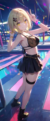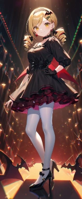 1girl, A kawaii lustful vampire girl with twin tails and bangs and sidelocks and yellow eyes and huge breasts and baby face and droppy eyes is standing in her room. salute and v, looking at viewer, smile, (pink hair streaks:1.0), (blonde hair:1.1), (bat hair ornaments, black leather heart-ring choker, heart drop earrings, feminine outfit, pink knit sweater with black bow neck, open shoulder, long sleeve with black bow cuff, metal heart ring black corset belt, suspender mini flare skirt, metal heart ring leg garter, white socks, heart strap black platform loafers), (energetic compositions, abstract particles, chromatic_aberration:0.9), (depth of field, full body, dutch angle, from front:0.9), close to viewer, (illustration, colorful lighting:1.2), Masterpiece, top quality, very detailed, <lora:flat2:-0.85> <lora:boldline:-1> ,