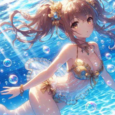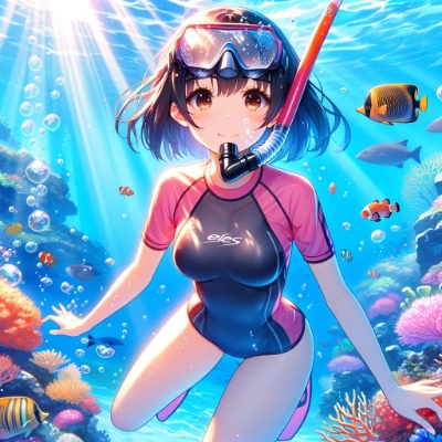Anime-style illustration of an East Asian girl with short black hair, wearing a sleek pink competitive swimsuit. She is snorkeling underwater in a clear blue sea, with bubbles dynamically trailing behind her. The underwater scene features vibrant coral reefs and various colorful anime-style fish. Sunlight rays pierce through the water, enhancing the magical atmosphere. She is equipped with snorkeling fins and a mask, her expression filled with wonder as she explores the marine environment.