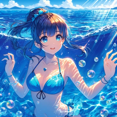 Anime-style illustration of an East Asian girl with short black hair, wearing a sleek competitive high cut blue swimsuit. She is snorkeling underwater in a clear blue sea, with bubbles dynamically trailing behind her. The underwater scene features vibrant coral reefs and various colorful anime-style fish. Sunlight rays pierce through the water, enhancing the magical atmosphere. She is equipped with snorkeling fins and a mask, her expression filled with wonder as she explores the marine environment.