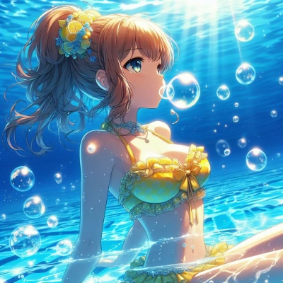 An anime-style illustration of a high school girl swimming in a vast, deep blue lake. Her hair is styled in a high ponytail, a defining characteristic of anime characters. She wears a striking sky-blue bikini that blends with the varying shades of blue in the water. The scene is enriched with playful light refractions dancing on the water\'s surface and bubbles rising from her mouth as she swims. Her hands are detailed with one thumb and four fingers each, in true anime fashion. The atmosphere of the scene is captivating, emphasizing the contrast between the girl\'s vibrant presence and the serene underwater environment.