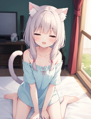 (cat girl, siesta, sleepy, half-opened eyes, cute roomwear:1.2), laid down, 1tail, bare shoulder, barefoot, bottomless, temptation, love, satisfied, (yumekawa, girly mood:0.5),