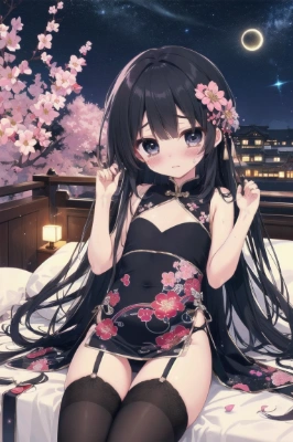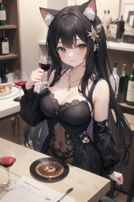 masterpiece, best quality, extremely detailed, masterpiece, best quality, ultra-detailed, a pretty woman, solo, one-piece dress, beautiful black hair, beautiful brown eyes, beautiful eyes, long hair, cat ears, hair ornaments, necklace, cup, coffee, wine glass, wine, smile, light smile, blush, sparkling effect, glitter effect, heart effect, cat, ,