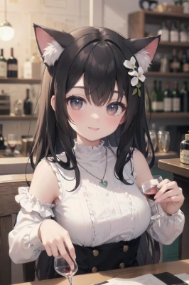 masterpiece, best quality, extremely detailed, masterpiece, best quality, ultra-detailed, a pretty woman, solo, one-piece dress, beautiful black hair, beautiful brown eyes, beautiful eyes, long hair, cat ears, hair ornaments, necklace, cup, coffee, wine glass, wine, smile, light smile, blush, sparkling effect, glitter effect, heart effect, cat, ,