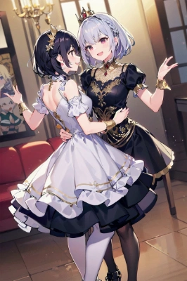 masterpiece, best quality, extremely detailed, anime,2 Princess girls, a luxurious silver dress, a double layered dress, intricate gold embroidery, gold decorations on the cuffs,Spreading skirt, red accent, short black hair, smile,wide skirt,short french braid,,indoors,red small accessories,petticoat,2 girls dancing,motion blur,dynamic angle,tights,,