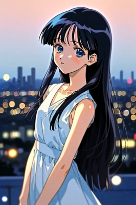 Anime, 1girl, "☺️"/ 90's Anime, 80's Anime/ Lo-Fi/ ("1dress, Pure white dress", sleeveless:1.3)/ collarbone/ TOKYO, Night city, starry sky/ ("upper body, close-up face":1.15)/ ("Black long hair":1.2)/ looking at viewer/ ("Blue eye's":0.9)/ Bokeh/ Blurred Backgrounds/ depth of field/ Aerial perspective/