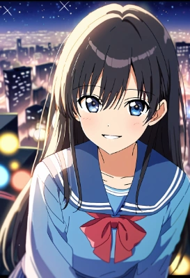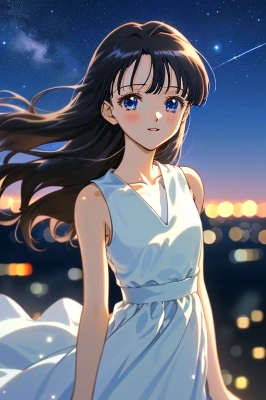 Anime, 1girl, Smile/ 90\'s Anime, 80\'s Anime/ Lo-Fi/ (\"1dress, Pure white dress\", sleeveless:1.3)/ collarbone/ TOKYO, Night city, starry sky/ (\"upper body, close-up face\":1.15)/ (\"Black long hair\":1.2)/ looking at viewer/ (\"Blue eye\'s\":0.9)/ Bokeh/ Blurred Backgrounds/ depth of field/ Aerial perspective/