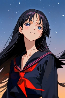 nime, 1girl, (\"Smile\":0.9)/ 90\'s Anime, 80\'s Anime/ Lo-Fi/ (\"Black sailor suit\", long sleeved:1.3)/ (\"1red neckerchief\":0.9)/ collarbone/ TOKYO, Night city, starry sky/ (\"upper body, close-up face\":1.25)/ (\"Black long hair\":1.35)/ looking at viewer/ (\"Blue eye\'s\":0.9)/ Bokeh/ Blurred Backgrounds/ depth of field/ Aerial perspective/
