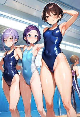 multiple women, androgynous, one piece swimsuit, dark blue, for school, armpit, high leg cut, shiny thighs, shy, smile, standing, school pool,,