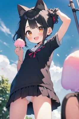 masterpiece, best quality, extremely detailed, anime, girl,<lora:flat2:0.55> <lora:hairdetailer:0> , bobcut, brown hair, purple eyes, (loli face:1.2),, cotton candy, big cotton candy, falling cotton_candys,