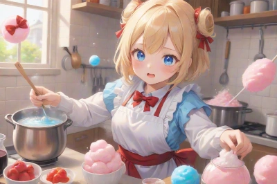 anime style girl, blonde short hair with blue eyes and wearing a red ribbon,(hair bow:1.3),red bow, looking up at the sky from a low angle, clouds floating in the sky resembling cotton candy, the girl's face filled with wonder and imagination, perspective from the ground looking up, capturing the girl and the whimsical clouds above her, her expression dreamy and thoughtful as she gazes at the clouds, the sky vast and expansive,