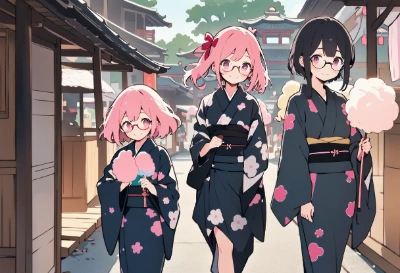 masterpiece, best quality, extremely detailed, high resolution, anime, 2 female children , pink eyes, pink hair, black eyes, black hair, walking side by side, smiling, (square glasses:1.2), kimono, Yukata, (holding cotton Candy:1.3), at stall street, shrine gate in the distance cowboy shot,