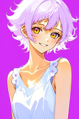 illustration, 1girl, ("Smile":0.95)/ collarbone/ "White sleeveless dress", one-piece dress/ "White short hair", Messy hair/ ("yellow Eye's":0.85)/ upper body, close-up face/ ("simple purple background":0.95)/ Partial line omission/