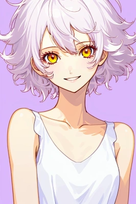 illustration, 1girl, ("Smile":0.95)/ collarbone/ "White sleeveless dress", one-piece dress/ "White short hair", Messy hair/ ("yellow Eye's":0.85)/ upper body, close-up face/ ("purple background, Simple plain background":0.95)/ Partial line omission/