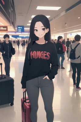 masterpiece, best quality, extremely detailed, anime, girl, longhair, black hair, wear a beanie cap, black eyes, idol, kpop, not tall, smile on her face, casual pants look, clothes in a subdued color, long sleeve, have a small stuffed animal in her hand, standing, international airport departure lobby, have a large suitcase on the floor for traveling abroad, <lora:flat1:1> <lora:eyecolle_pelargonium_v100:1> ,