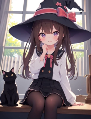 (magican girl, witch hat:1.2), cute black cat, simple cute kitty, dark room, in wooden library, brown hair, (mysterious mood:0.6), black robe, bare knee,